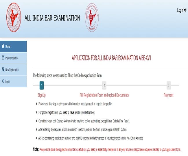 ऑनलाइन रजिस्ट्रेशन करने के लिए, उम्मीदवार पहले ऑफिशियल वेबसाइट, allindiabarexamination.com पर जाएं. अब होमपेज पर दिए गए Registration लिंक पर क्लिक करें. अब एक नया टैब ओपन किया जाएगा. यहां न्यू रजिस्ट्रेशन लिंक के जरिये रजिस्ट्रेशन की प्रक्रिया पूरी करें. इसके बाद, अपने यूजरनेम और पासवर्ड के माध्यम से लॉगइन करके आगे की आवेदन प्रक्रिया पूरी कर सकते हैं. अभ्यर्थियों को ध्यान रखना होगा कि आवेदन करने से पहले, उन्हें ऑफिशियल वेबसाइट पर जाकर आवेदन से संबंधित दिशानिर्देशों को अच्छी तरह से चेक कर लेना चाहिए.