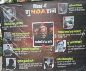 पोस्टर के चारों कोनों में बिहार में हाल में हुई आठ बड़ी हत्याओं का ज़िक्र किया गया है, जिनमें तस्वीरें और तारीखें भी शामिल हैं.
