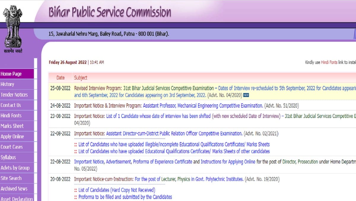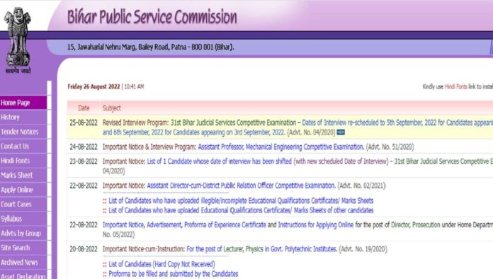 पटना: बिहार लोक सेवा आयोग (BPSC) ने विज्ञापन संख्या- 04/2020 के तहत 31वीं बिहार न्यायिक सेवा मुख्य परीक्षा के आधार पर सफल घोषित उम्मीदवारों के इंटरव्यू का शेड्यूल 5 अगस्त को जारी किया था. बीपीएससी की ऑफिशियल वेबसाइट, bpsc.bih.nic.in पर साक्षात्कार कार्यक्रम उपलब्ध कराया गया था. कार्यक्रम के अनुसार, इंटरव्यू का आयोजन 22 अगस्त से शुरू है. अब आयोग ने इंटरव्यू के संबंध में महत्वपूर्ण सूचना जारी की है.