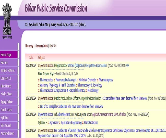 BPSC Drug Inspector Final Answer Key 2024: पटना: बिहार लोक सेवा आयोग के विज्ञापन संख्या- 09/2022 के तहत ड्रग इंस्पेक्टर के पदों पर भर्ती के लिए जो अभ्यर्थी लिखित परीक्षा में शामिल हुए थे उनके लिए काम की खबर है. आयोग ने लिखित परीक्षा की फाइनल ‘आंसर की’ जारी कर दी है. सभी आठों विषयों की फाइनल आंसर की ऑफिशियल वेबसाइट पर उपलब्ध है. bpsc.bih.nic.in पर विजिट कर उम्मीदवार इसे चेक कर सकते हैं.