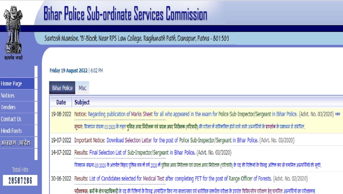 BPSSC SI Exam 2020 Marksheet: बिहार पुलिस सबोर्डिनेट सर्विस कमीशन (BPSSC) ने विज्ञापन संख्या-03/2020 के तहत पुलिस सब इंस्पेक्टर (Sub Inspector) और सर्जेंट (Sergeant) के पदों पर भर्ती के लिए अंतिम रूप से चयनित अभ्यर्थियों की सूची 14 जुलाई 2022 को जारी की थी. अब आयोग ने एक महत्वपूर्ण सूचना प्रकशित की है. सूचना में कहा गया है कि परीक्षा में शामिल होने वाले सभी उम्मीदवारों की मार्कशीट ऑफिशियल वेबसाइट पर उपलब्ध कराई जा रही है.
