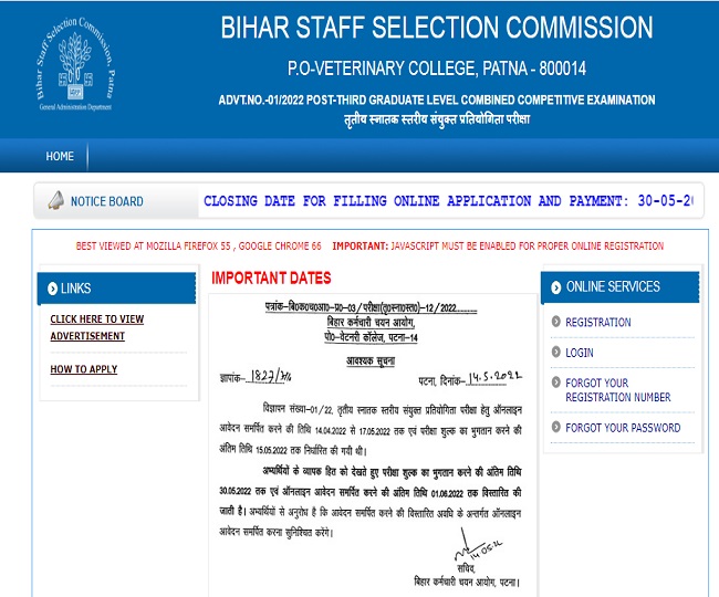 BSSC 3rd Graduate Level Exam 2022: बिहार कर्मचारी चयन आयोग (BSSC) ने तृतीय संयुक्त स्नातक स्तरीय प्रतियोगिता परीक्षा 2022 के लिए आवेदन की लास्ट डेट आगे बढ़ा दी है. इस संबंध में आयोग ने अपनी ऑफिशियल वेबसाइट पर एक शॉर्ट नोटिस जारी किया है. नोटिस में कहा गया है कि अभ्यर्थियों के व्यापक हित को देखते हुए परीक्षा शुल्क का भुगतान करने और ऑनलाइन आवेदन फॉर्म भरने की अंतिम तिथि को विस्तारित किया गया है.