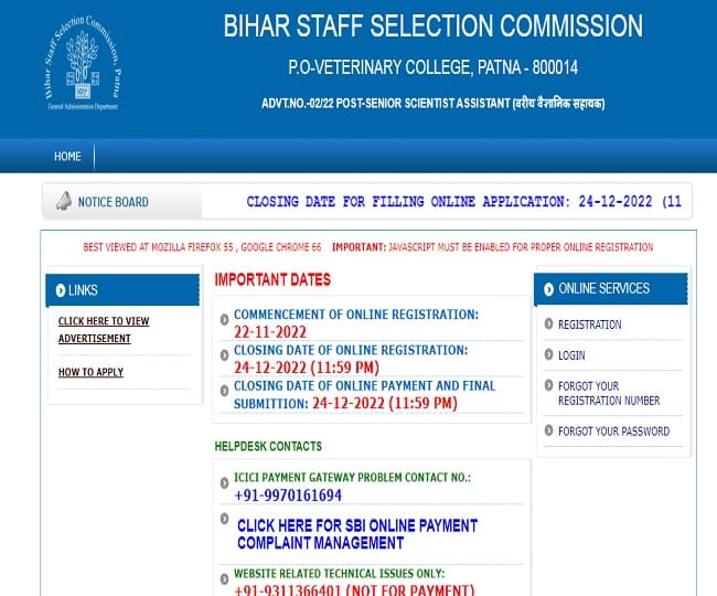 BSSC Senior Scientist Assistant Recruitment 2022: बिहार कर्मचारी चयन आयोग ने विज्ञापन संख्या- 02/22 के तहत सीनियर साइंटिस्ट असिस्टेंट (वरीय वैज्ञानिक सहायक) के पदों पर भर्ती के लिए 19 नवंबर को नोटिफिकेशन जारी किया है. इस भर्ती के माध्यम से कुल 100 पदों को भरा जाना है. इसके लिए ऑनलाइन आवेदन की प्रक्रिया 22 नवंबर 2022 से शुरू हो चुकी है. आवेदन करने की आखिरी तारीख 24 दिसंबर 2022 है.