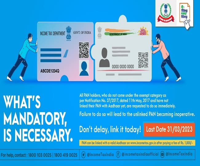 PAN Aadhar Link: आयकर विभाग ने शनिवार को एक परामर्श जारी करते हुए कहा कि अगले साल मार्च तक आधार क्रमांक से नहीं जुड़े स्थायी खाता संख्या (पैन) को ‘निष्क्रिय’ घोषित कर दिया जाएगा. आयकर विभाग की तरफ से जारी परामर्श के मुताबिक, ”आयकर अधिनियम, 1961 के अनुसार छूट वाली श्रेणी में आने वाले लोगों को छोड़कर सभी पैन धारकों के लिए 31 मार्च, 2023 से पहले अपने पैन को आधार से जोड़ना अनिवार्य है. आधार से नहीं जोड़े गए पैन कार्ड 1 अप्रैल, 2023 से निष्क्रिय हो जाएंगे.”